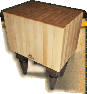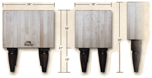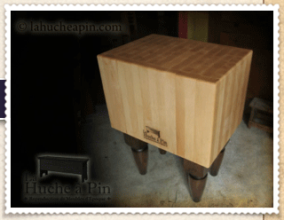 Ce bloc est constitué d’un tablier de 2 pouces en érable massif, entouré d’une jupe, elle aussi en érable, de 1 pouce et trois-quart. Le tout donne l’aspect d’un bloc massif sans l’inconvénient du poids excessif. Les pattes en pin massif de 4 pouces et demi, sont amovibles verticalement pour donner un ajustement en hauteur, variant de 31 à 35 pouces.