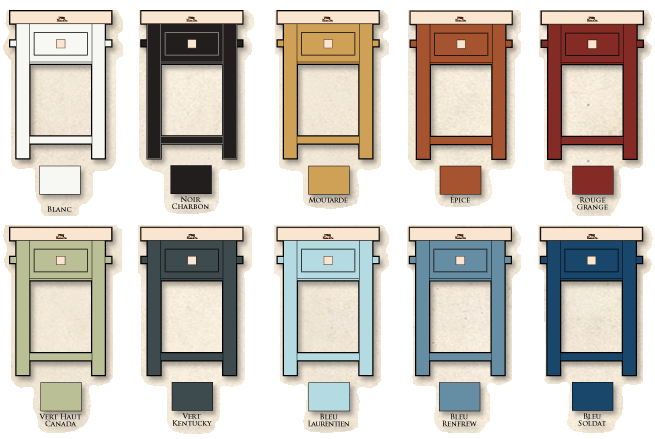 Tous les meubles et accessoires fabriqués dans notre atelier sont offerts à l’état brut ou dans une gamme de finition d’une grande variété.
